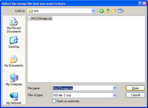 - The window "Select the image file that you want to burn" opens, browse to the ISO file you wish to burn and click "Open".